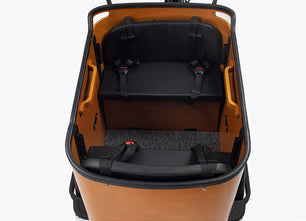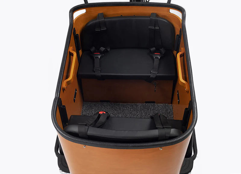Den store rummelige ladkasse måler 106,5cm i længden og 70cm i bredden. I en Mobike Curve Cruiser er der selvfølgelig monteret 2 bænke og 4 sikre seler til børnene.