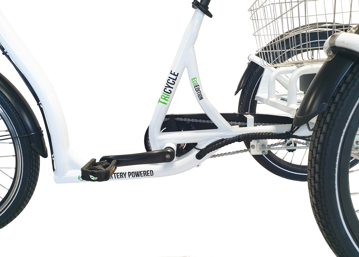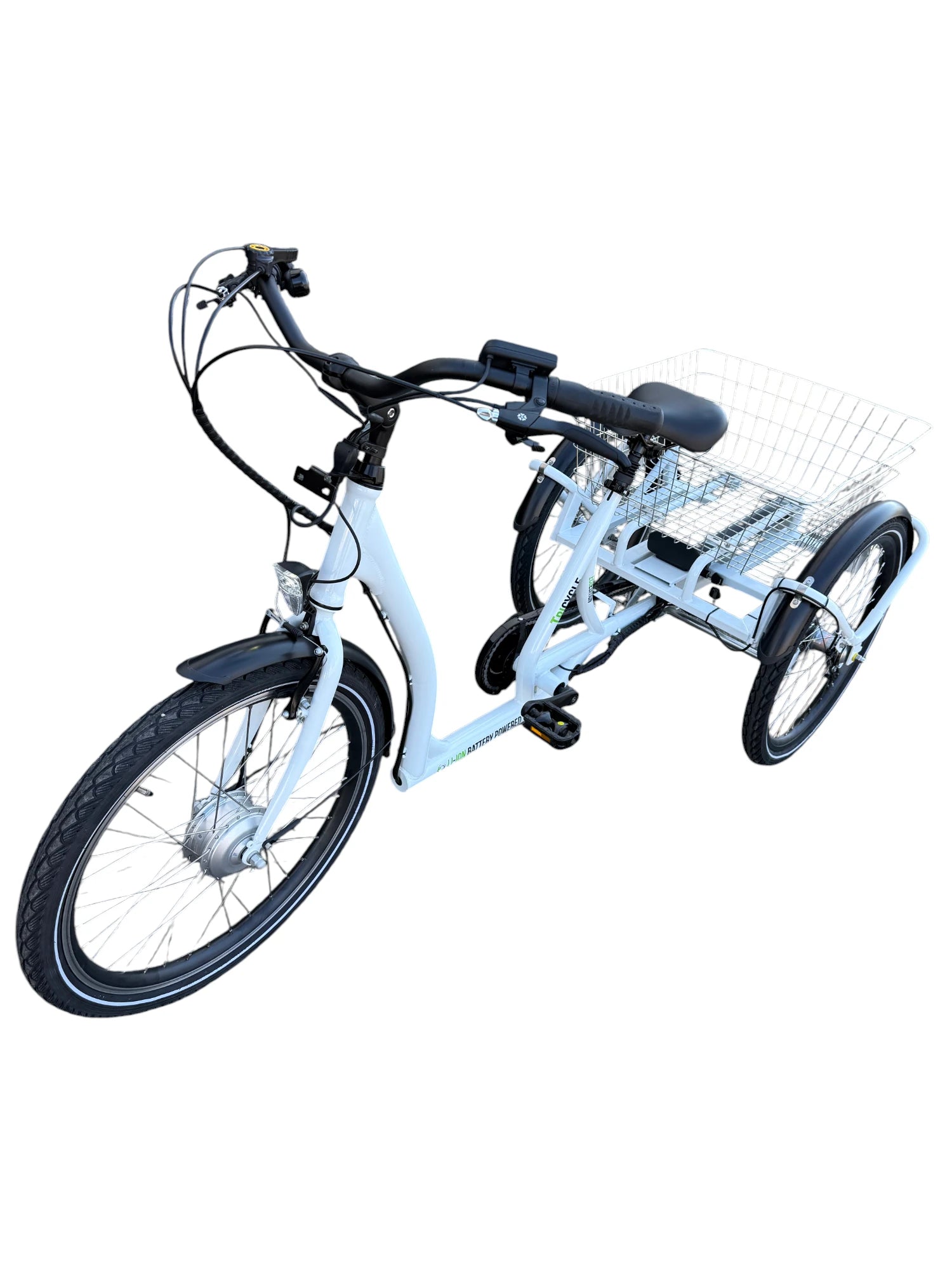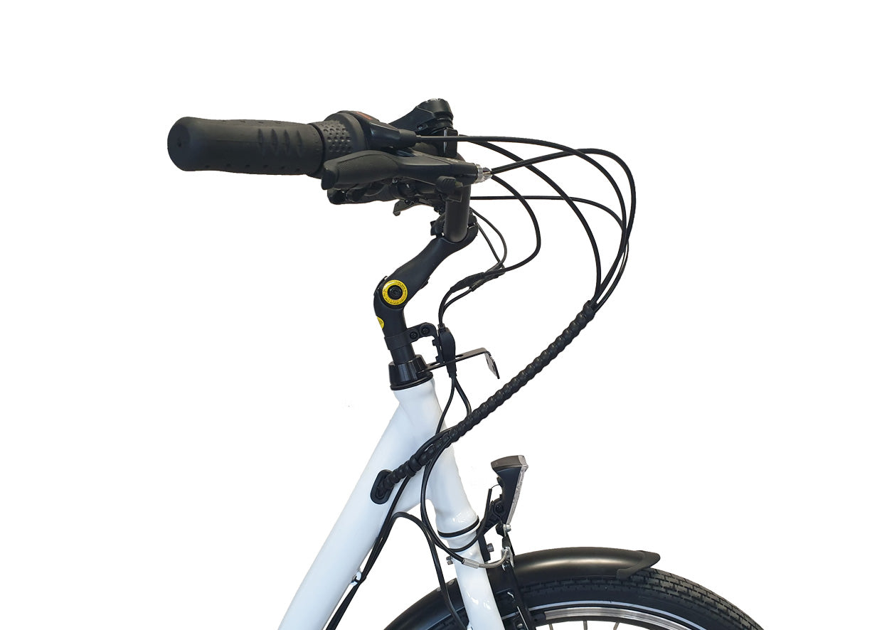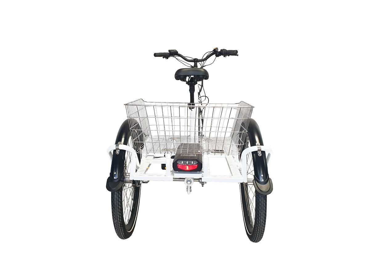 Cyklens lakering er hvid med sorte skærme. Bemærk den meget lave indstigningshøjde og store kurv til f.eks. indkøb.