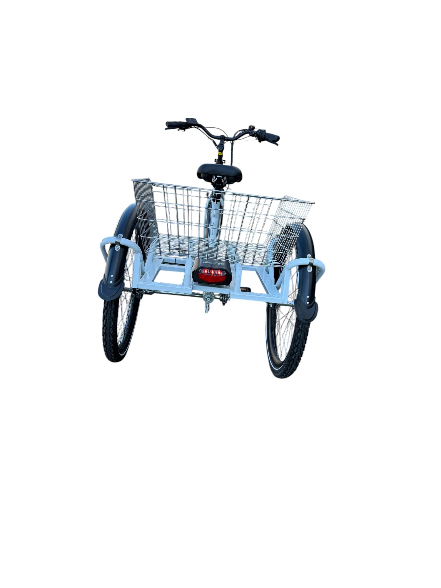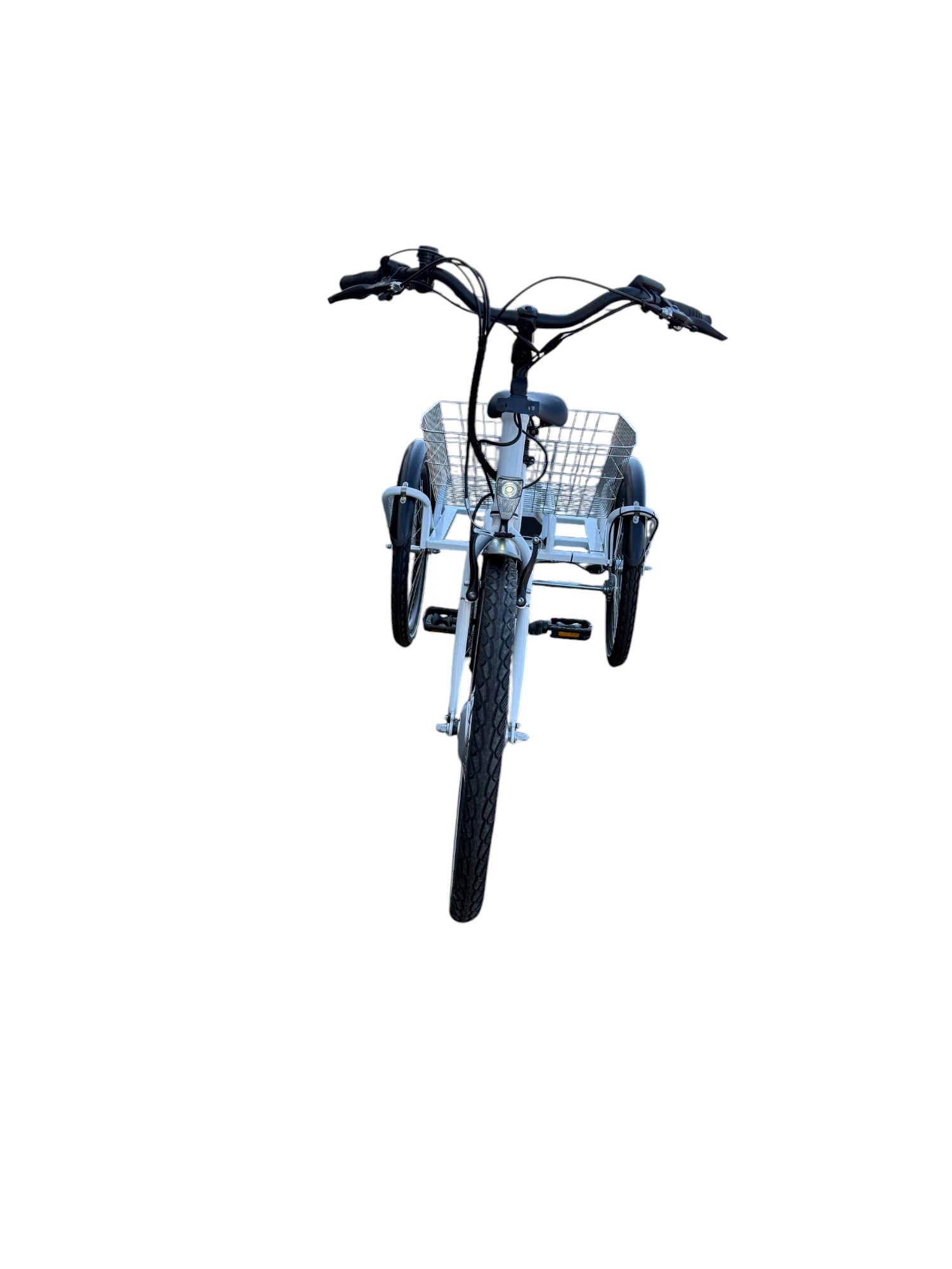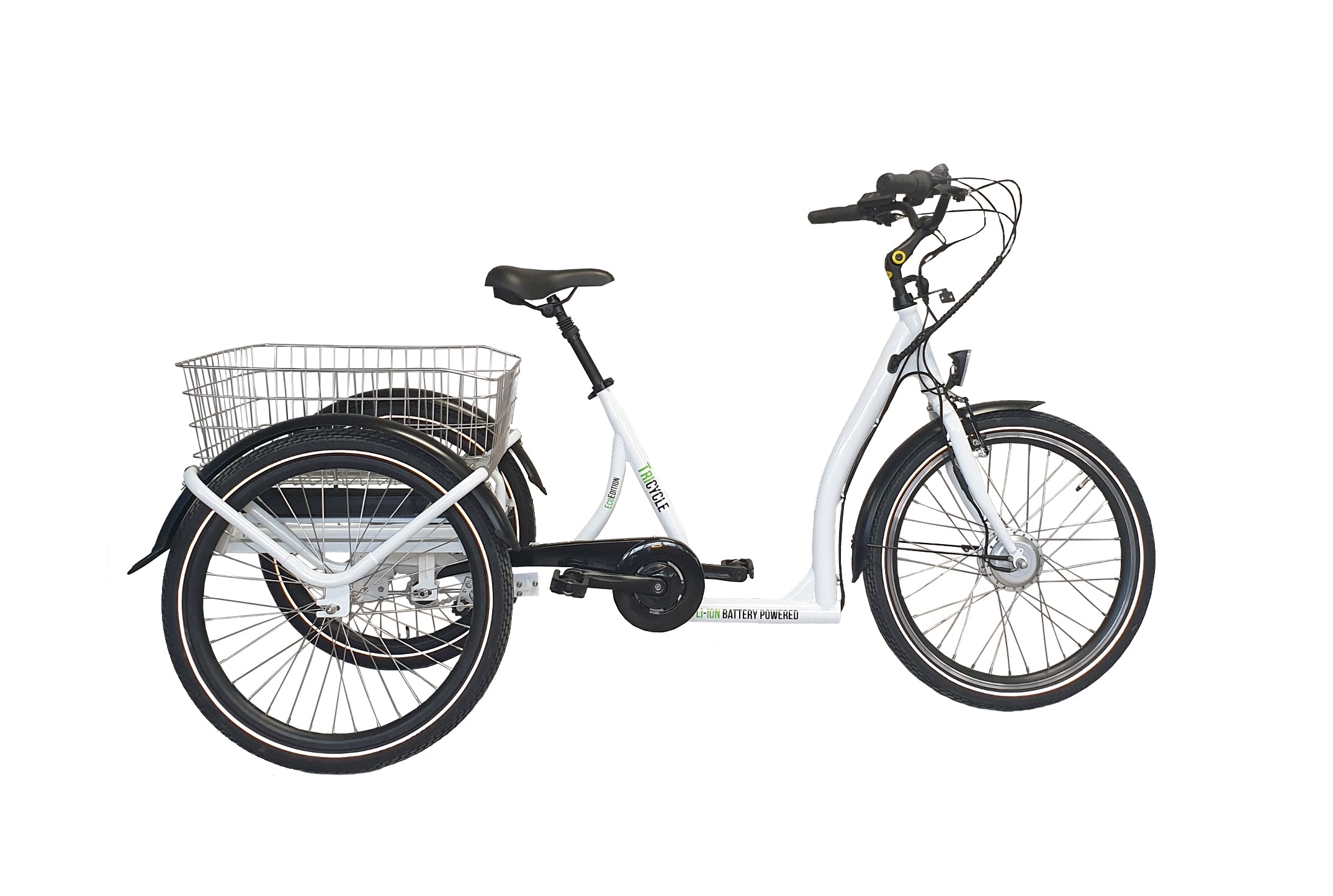 Cyklens lakering er hvid med sorte skærme. Bemærk den meget lave indstigningshøjde og store kurv til f.eks. indkøb.